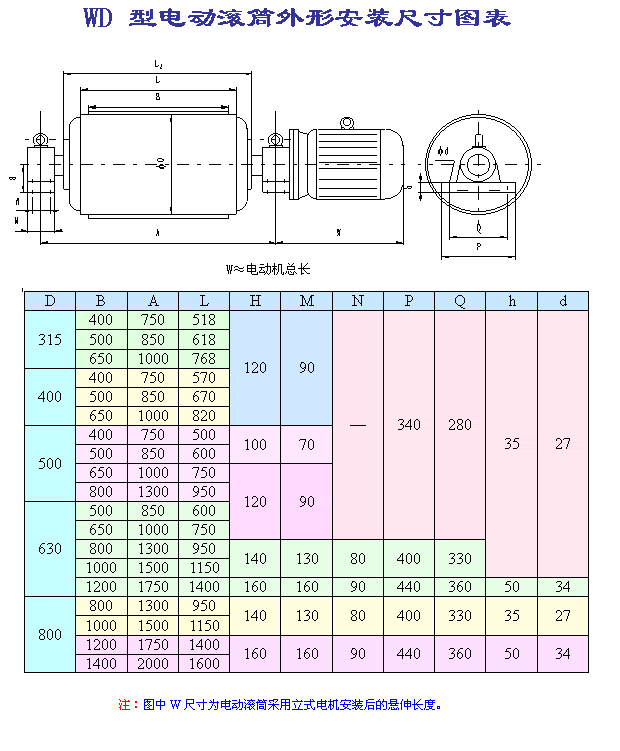 (1).因目前外裝式電動滾筒尚未制定相關行業(yè)標準,本廠將該型號電動滾筒首位代號用W(“外裝”的首位漢語拼音)表示。外裝式電動滾筒外置電機可分為立式電機和臥式電機,用戶訂購時請加以說明;